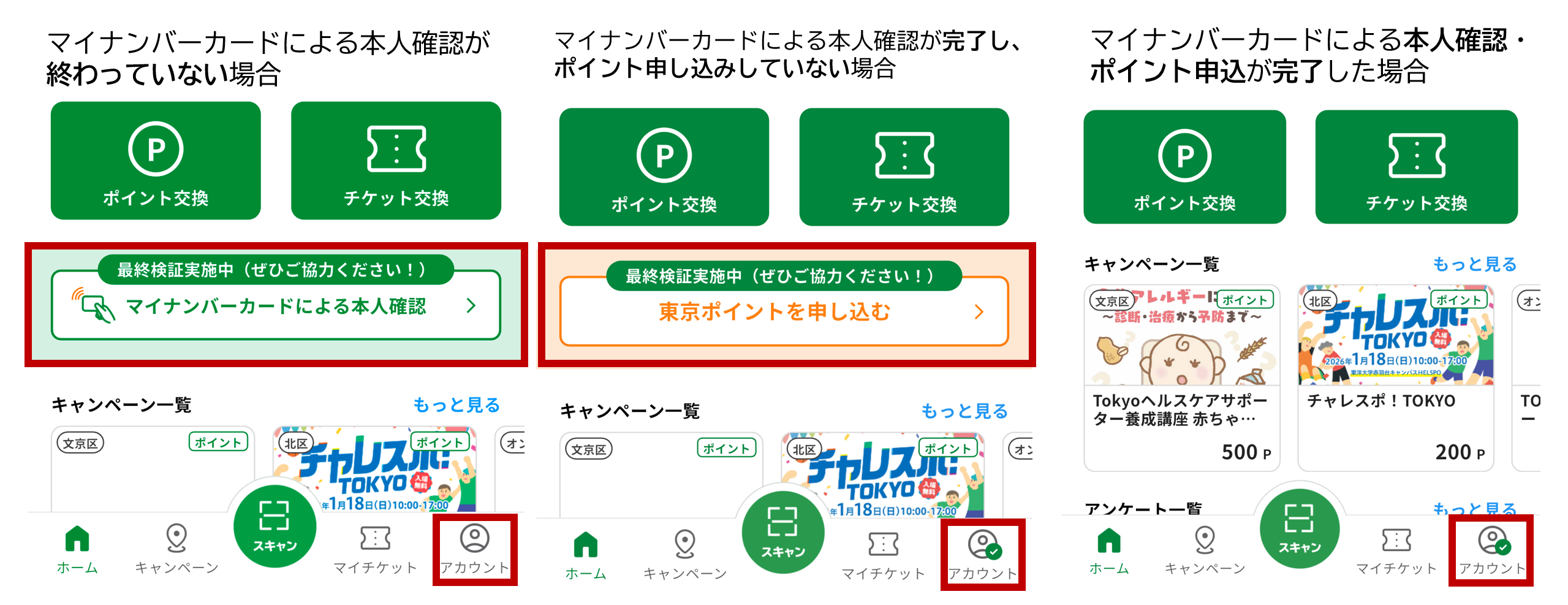 ホーム画面にオレンジ色のバナー〈東京ポイントを申し込む〉が表示されず、ホーム画面右下の〈アカウント〉アイコンに緑色のチェックマークがついている場合は、ポイントの申し込みは完了しています。